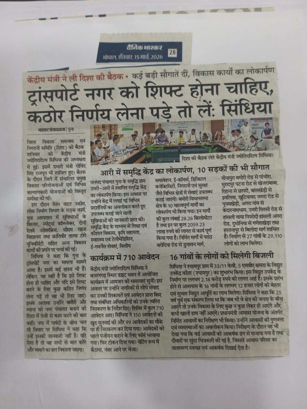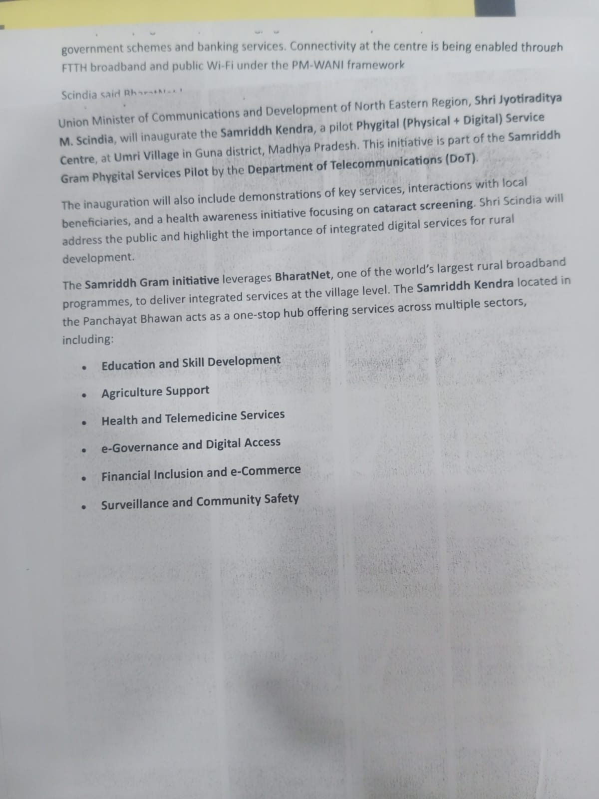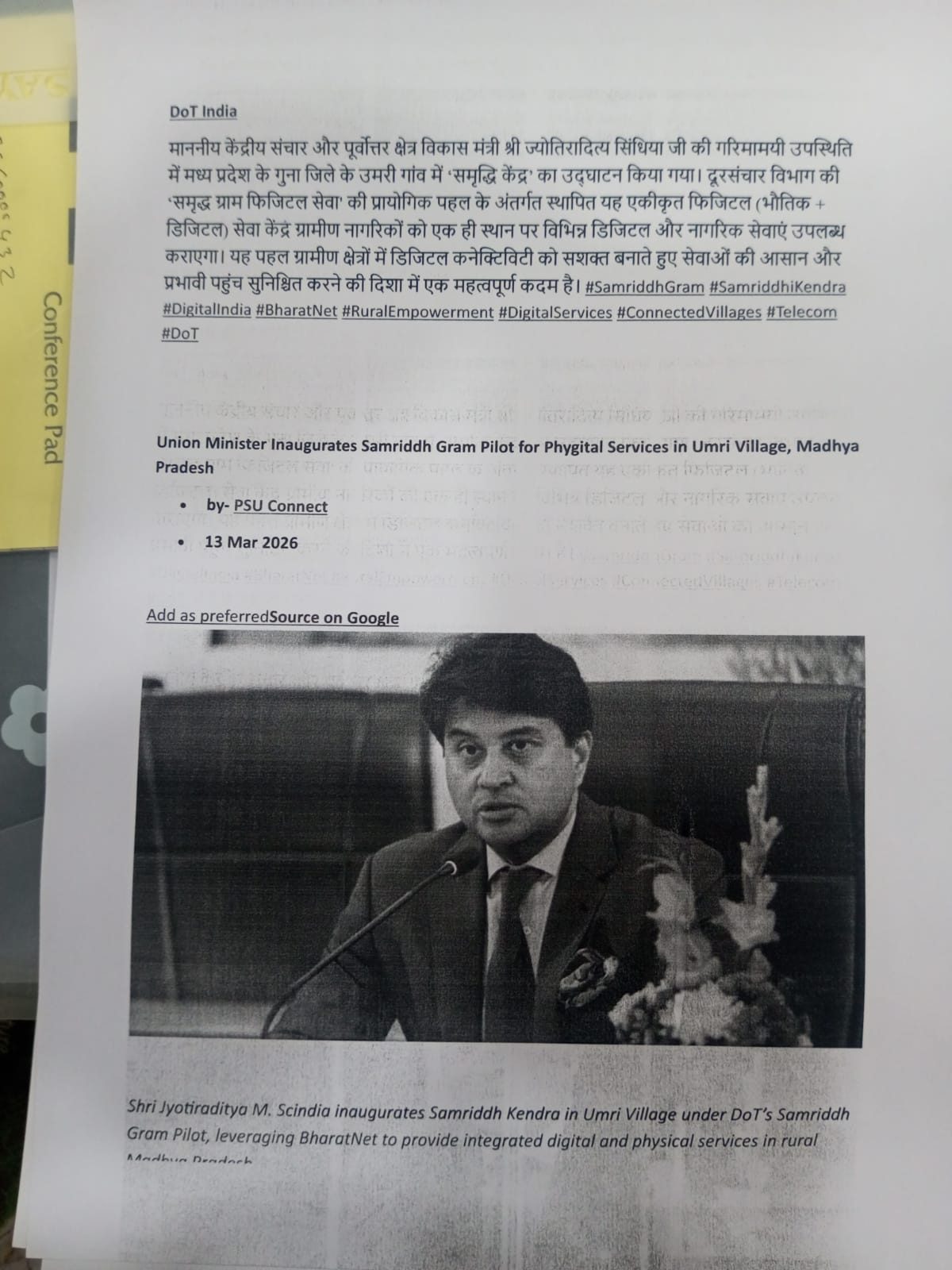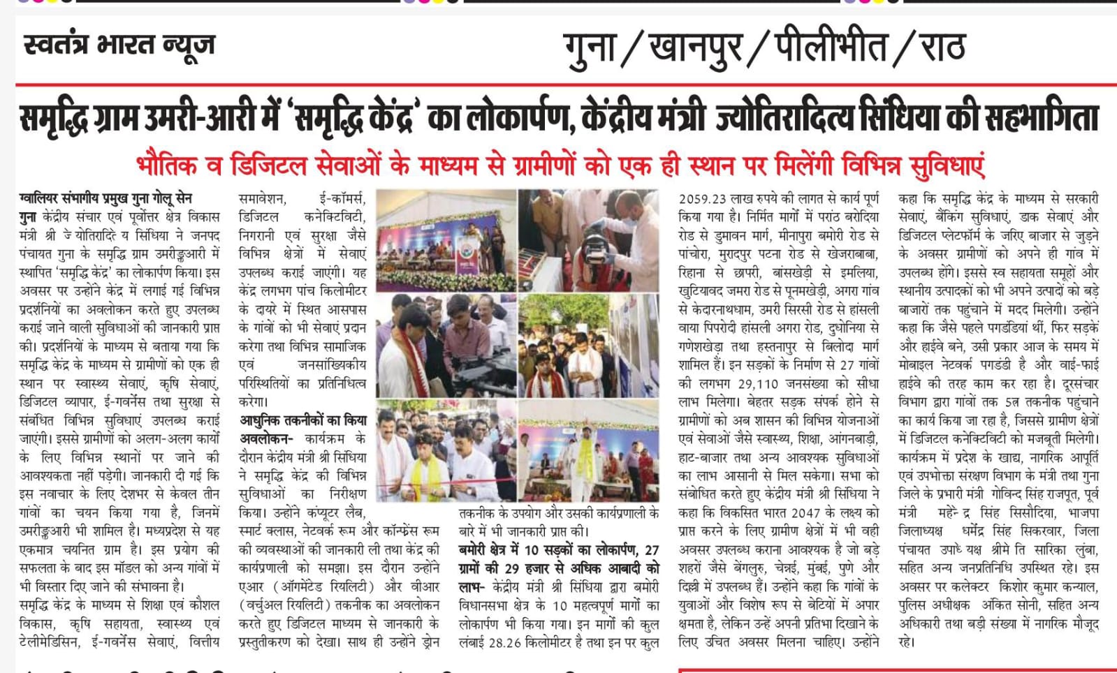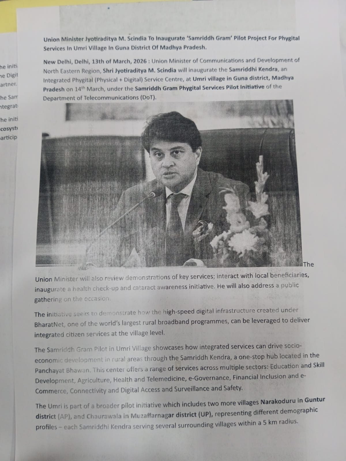 Union Minister Jyotiraditya M. Scindia To Inaugurate ‘Samriddh Gram’ Pilot Project For Phygital Services In Umri Village In Guna District Of Madhya Pradesh